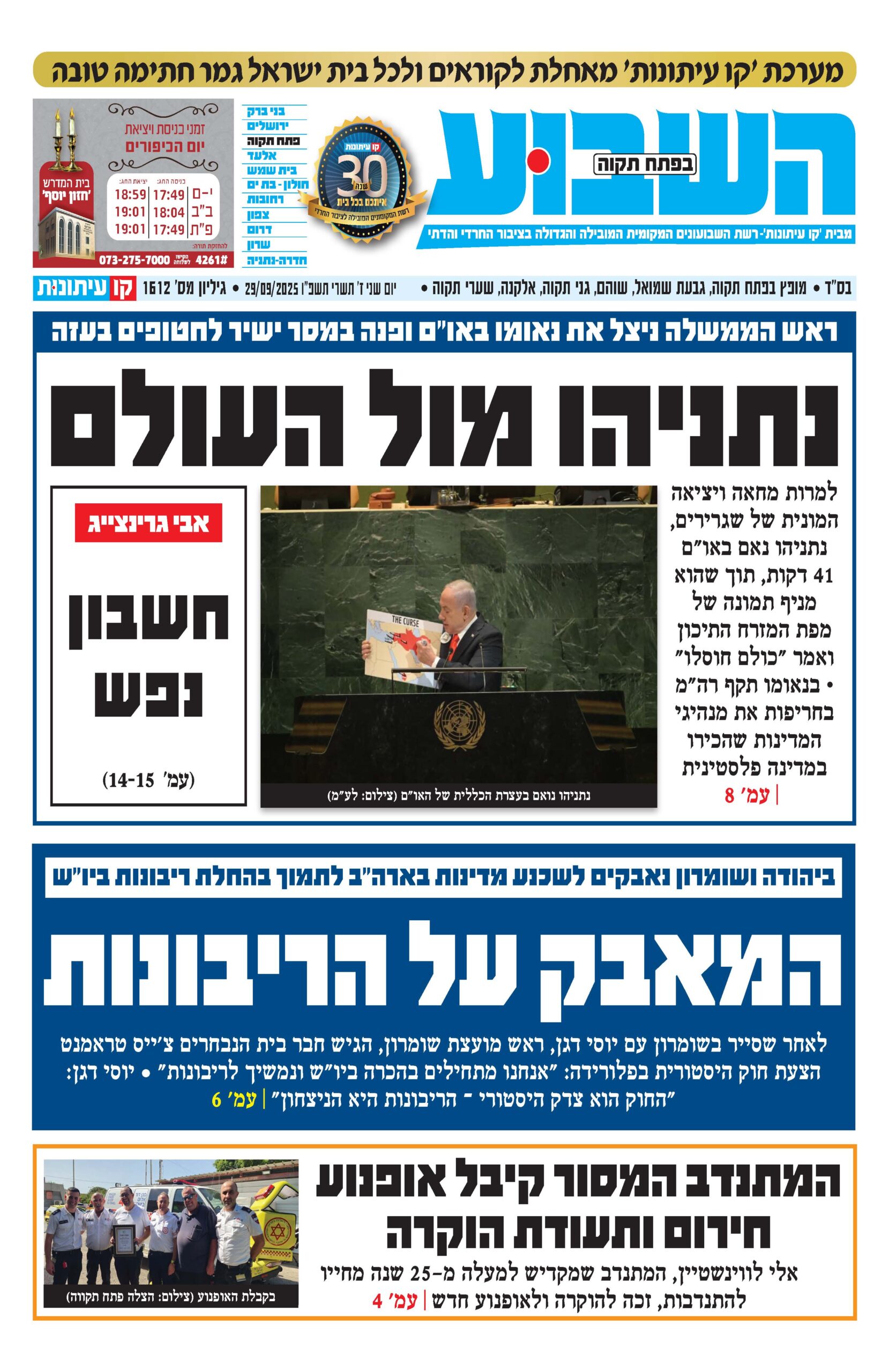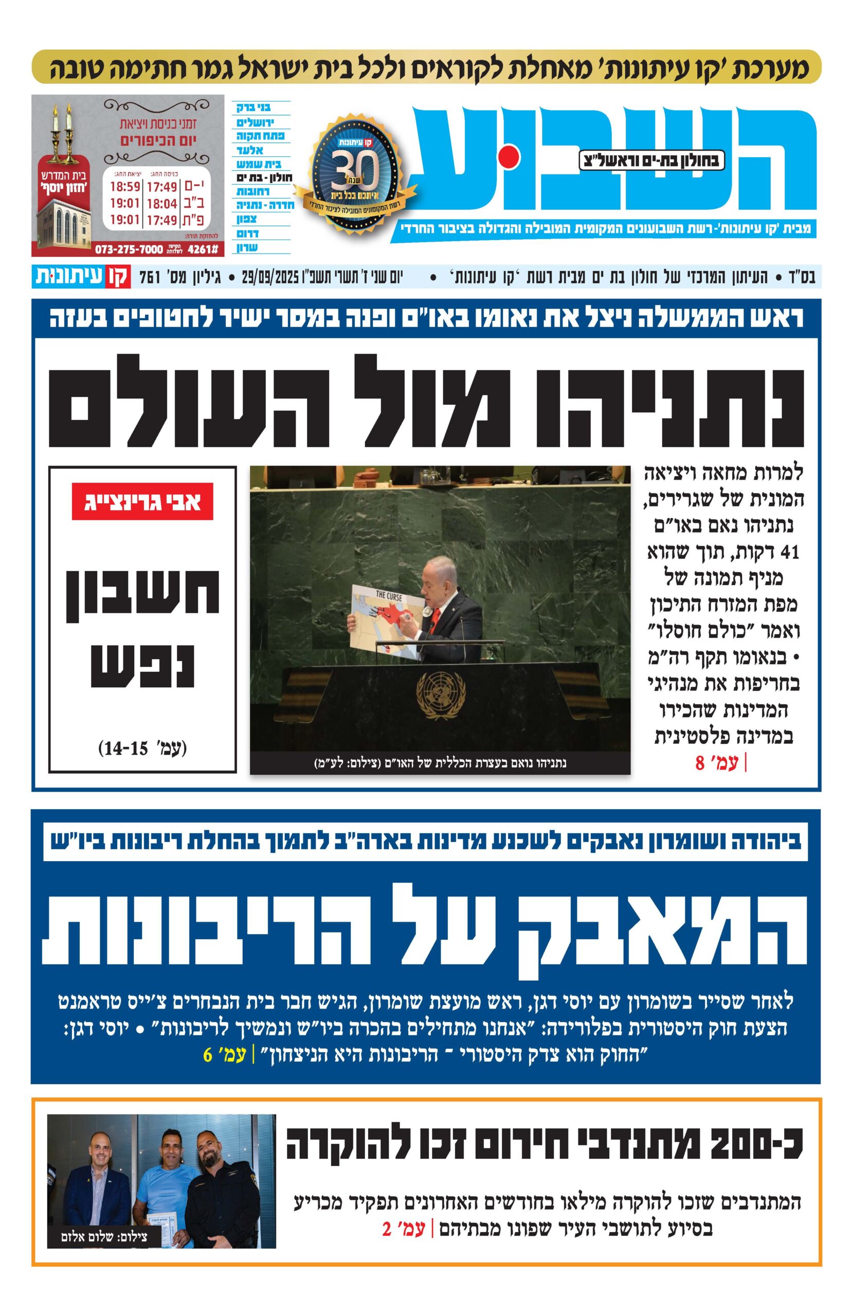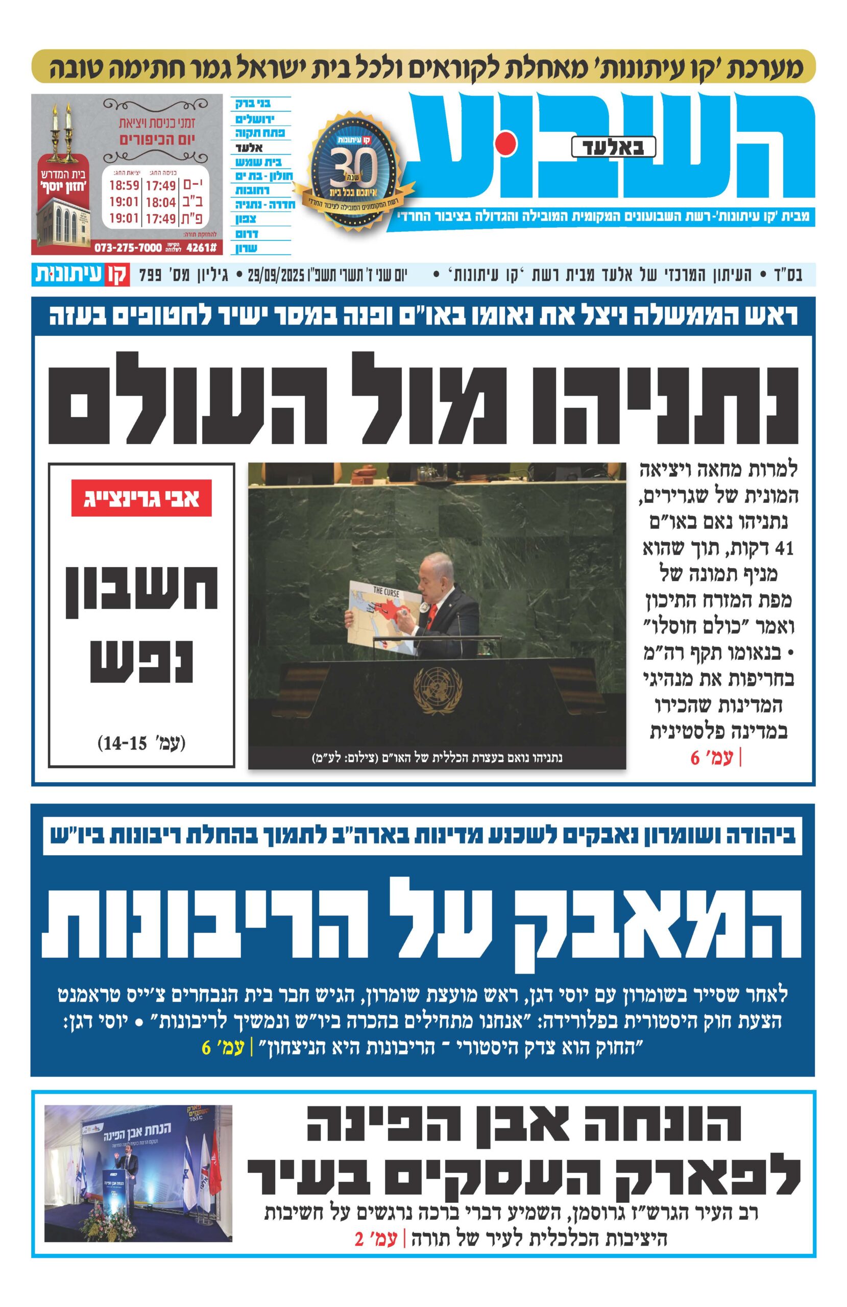 לוח מזל וברכה 30 מרץ השבוע בפתח תקוה 30 ספט השבוע בירושלים 30 ספט קול העיר בני ברק 30 ספט השבוע ברחובות 30 ספט השבוע בבית שמש 30 ספט חולון בת-ים וראשל"צ 30 ספט השבוע באלעד 30 ספט מוספים מיוחדים 9 אפר מוסף שבת 12 מרץ כל ישראל 12 מרץ ביזנס 4 מרץ