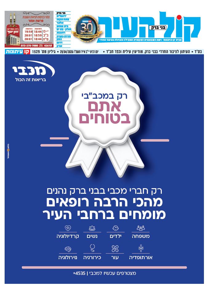 לוח מזל וברכה 30 מרץ השבוע בפתח תקוה 12 מרץ השבוע בירושלים 18 מרץ קול העיר בני ברק 26 מרץ השבוע ברחובות 12 מרץ השבוע בבית שמש 12 מרץ חולון בת-ים וראשל"צ 12 מרץ השבוע באלעד 12 מרץ מוספים מיוחדים 5 אוק מוסף שבת 12 מרץ כל ישראל 12 מרץ ביזנס 4 מרץ
